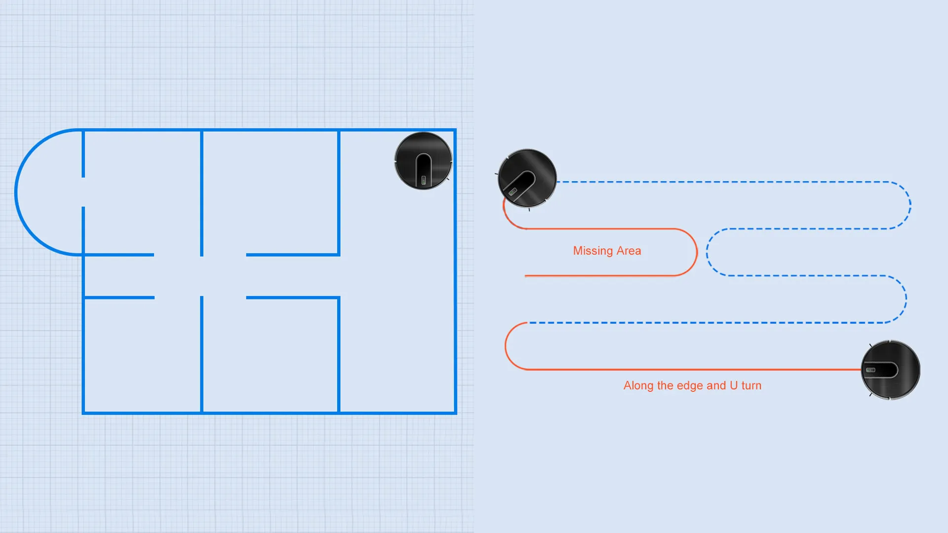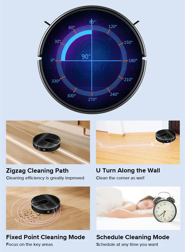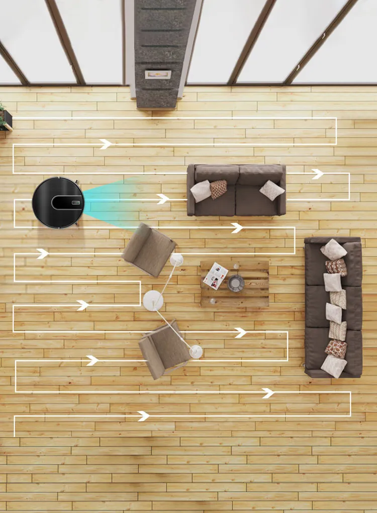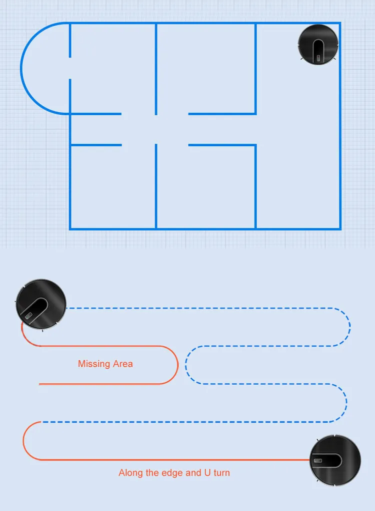 The coordinate storage algorithm allows the robot to recognize the surroundings and find the shortcut to charge when the battery is low. And the robot calculates how much power is needed in the remaining space, goes back, charges enough power and then continues cleaning.