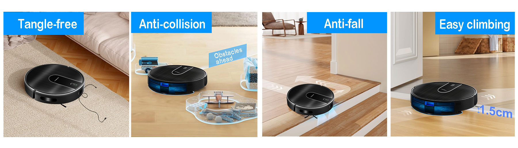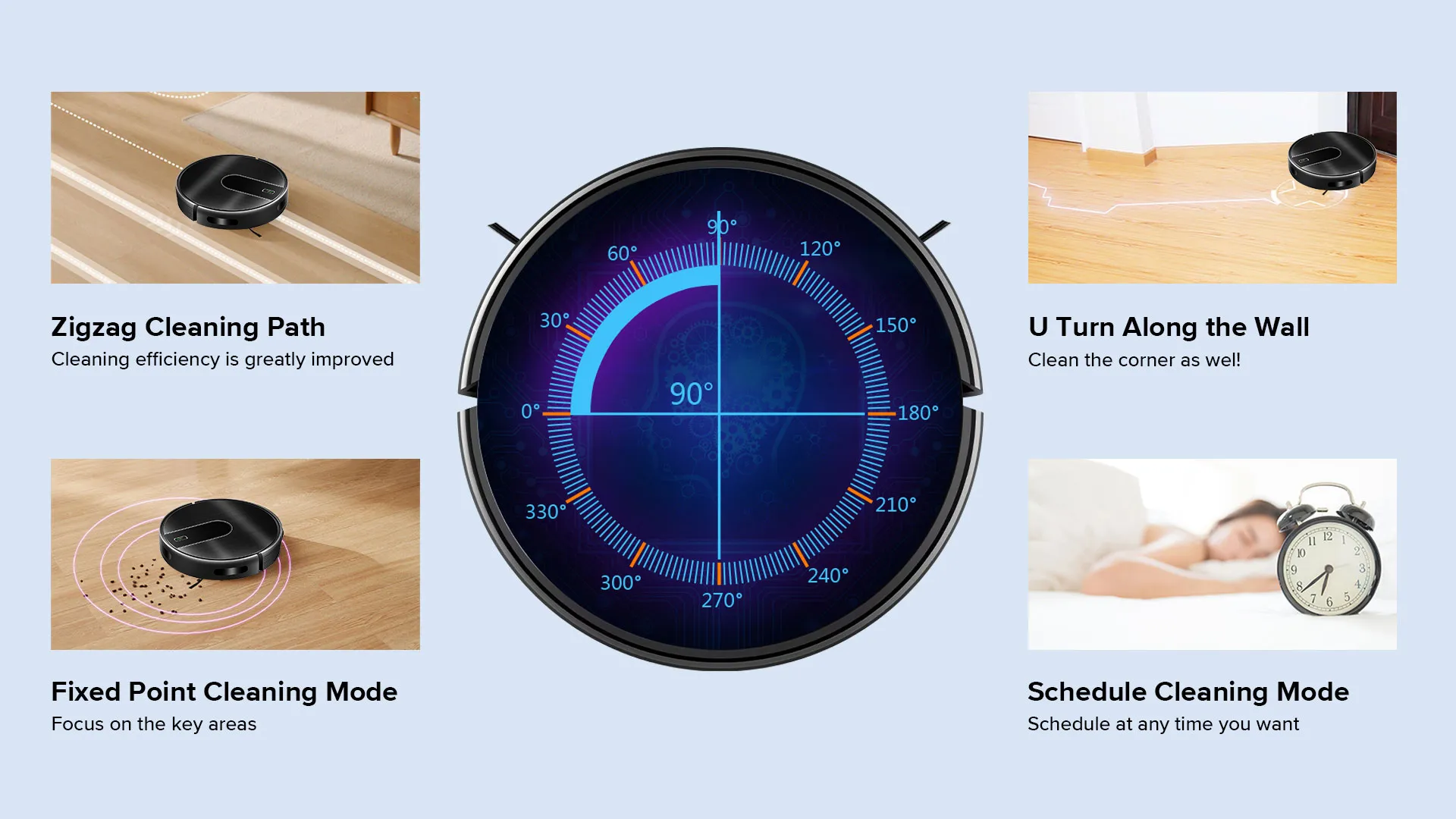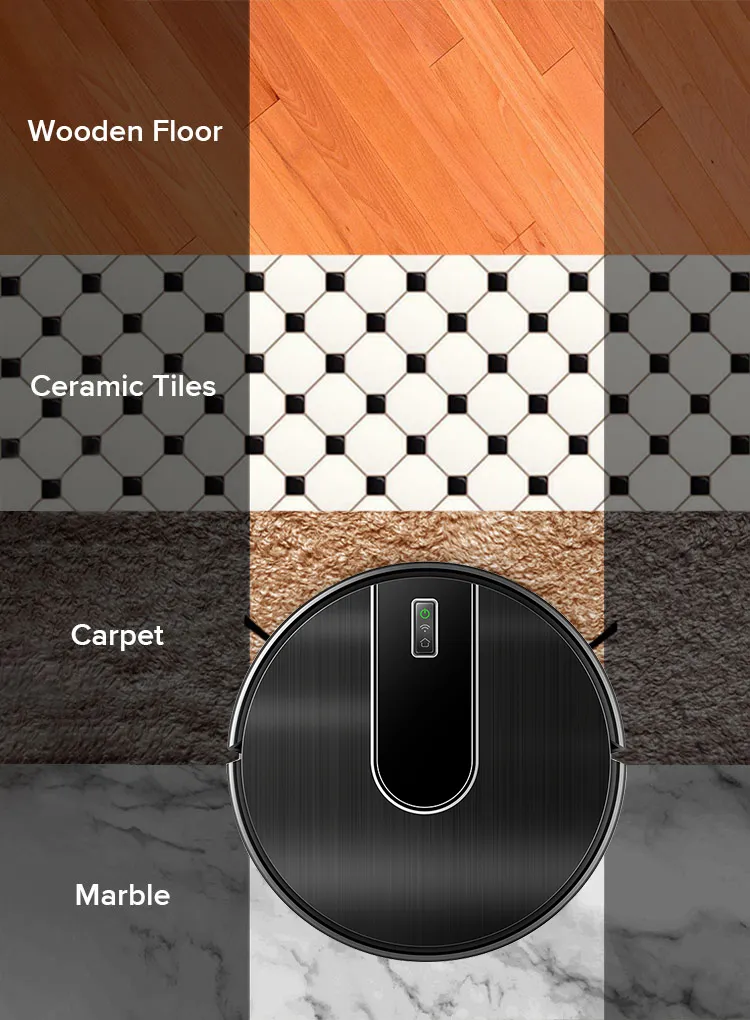 The coordinate storage algorithm allows the robot to recognize the surroundings and find the shortcut to charge when the battery is low. And the robot calculates how much power is needed in the remaining space, goes back, charges enough power and then continues cleaning.